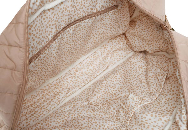 Deze prachtige luiertas is super praktisch met handige vakken , een verstelbaar hengsel om aan je schouder te hangen of aan de wandelwagen. Er zit ook een verschoonmatje bij zodat je je kleintje overal kan verschonen.