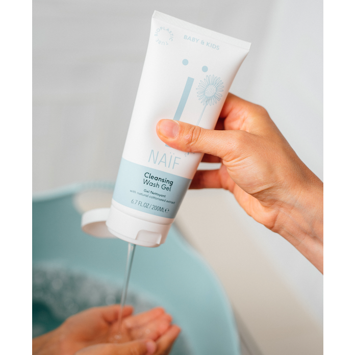 De milde wasgel van Naïf bestaat uit natuurlijke ingrediënten zoals katoenzaadextract , zo was je je baby niet alleen schoon , maar verzorg je tegelijkertijd het babyhuidje.