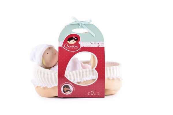 Pop met draagwiegje , zuigfles en dekentje.