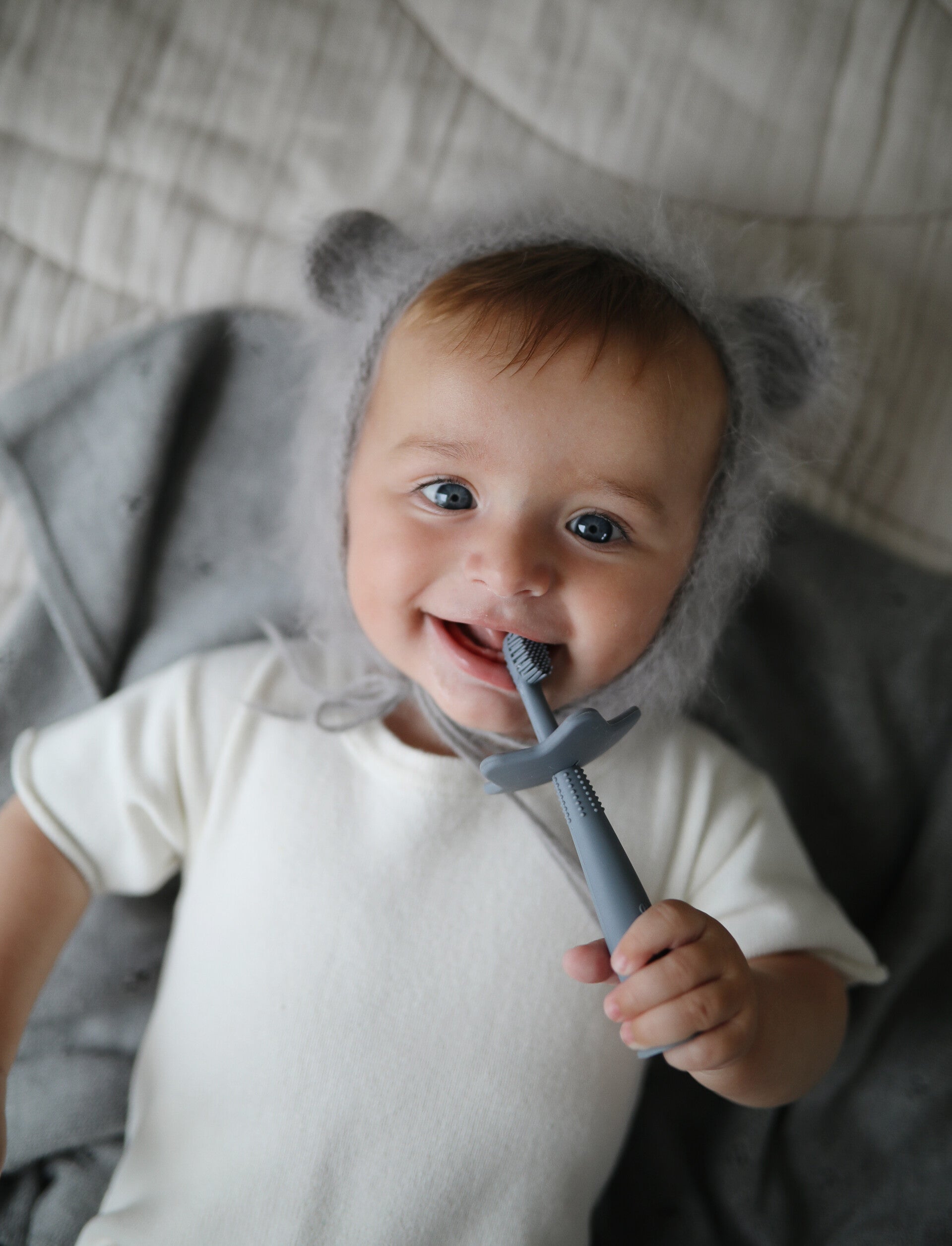 Deze leuke tandenborstel van Mushie is een must have als je kleintje tandjes begint te krijgen.