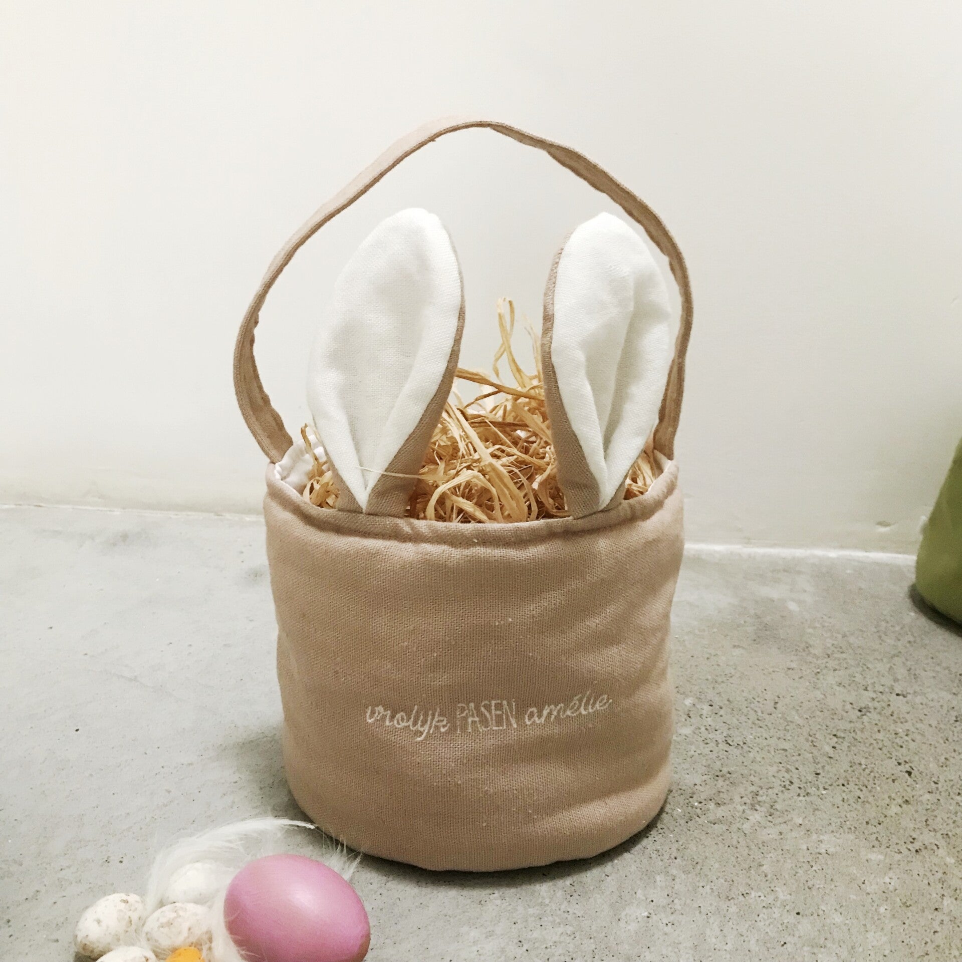 Dit linnen paasmandje is met de hand gemaakt door VIS TA VI.